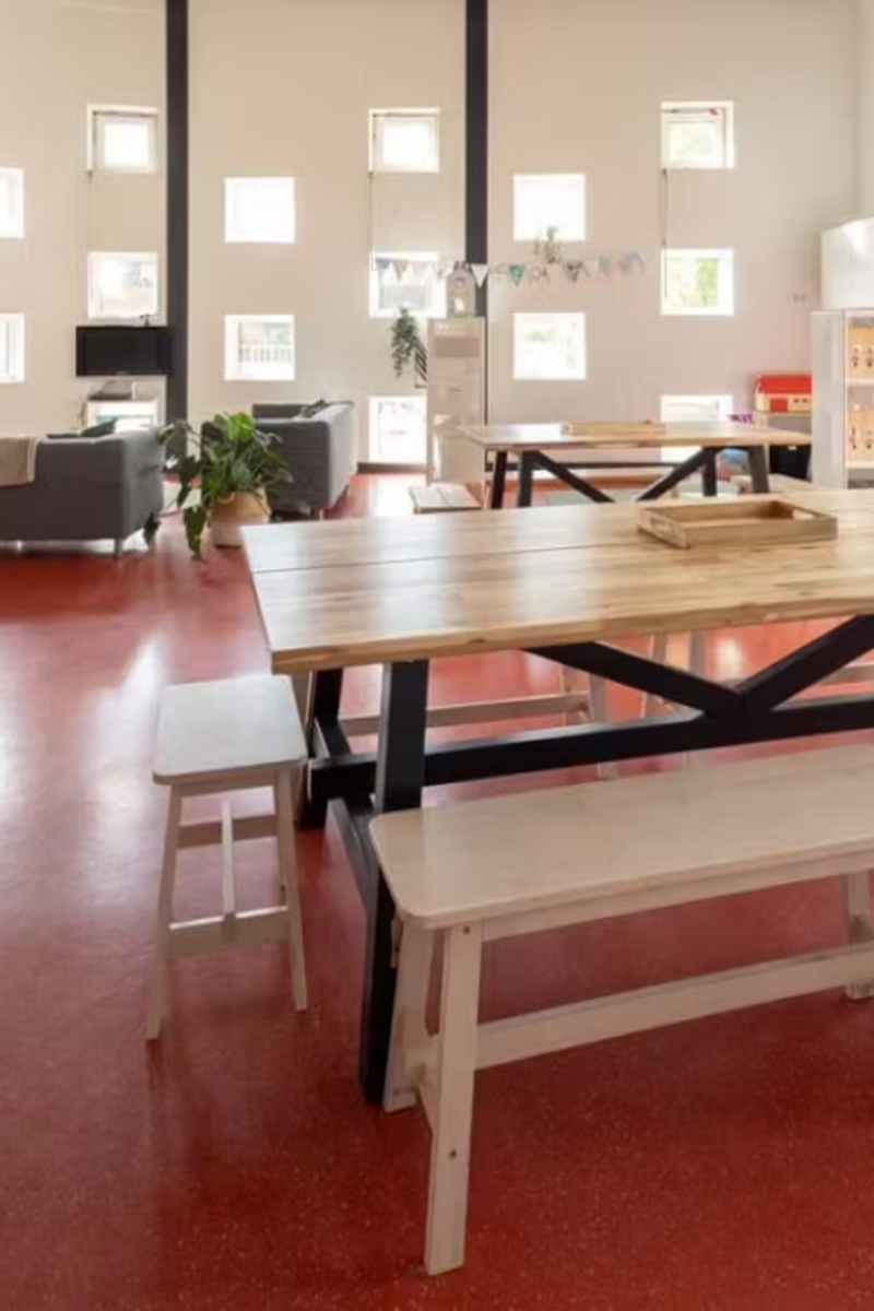 De groepsruimte is knus ingedeeld met verschillende hoeken, waarbij de ronding van het lokaal een dynamisch effect heeft. In een huiselijke en vertrouwde omgeving kan je kind meedoen aan allerlei activiteiten en workshops. Lekker chillen? (Buiten) spelen met vriendjes? Dat kan natuurlijk ook! Het schoolplein is ruim opgezet en leent zich uitstekend voor balspellen, verstoppertje of andere gezellige buitenactiviteiten.